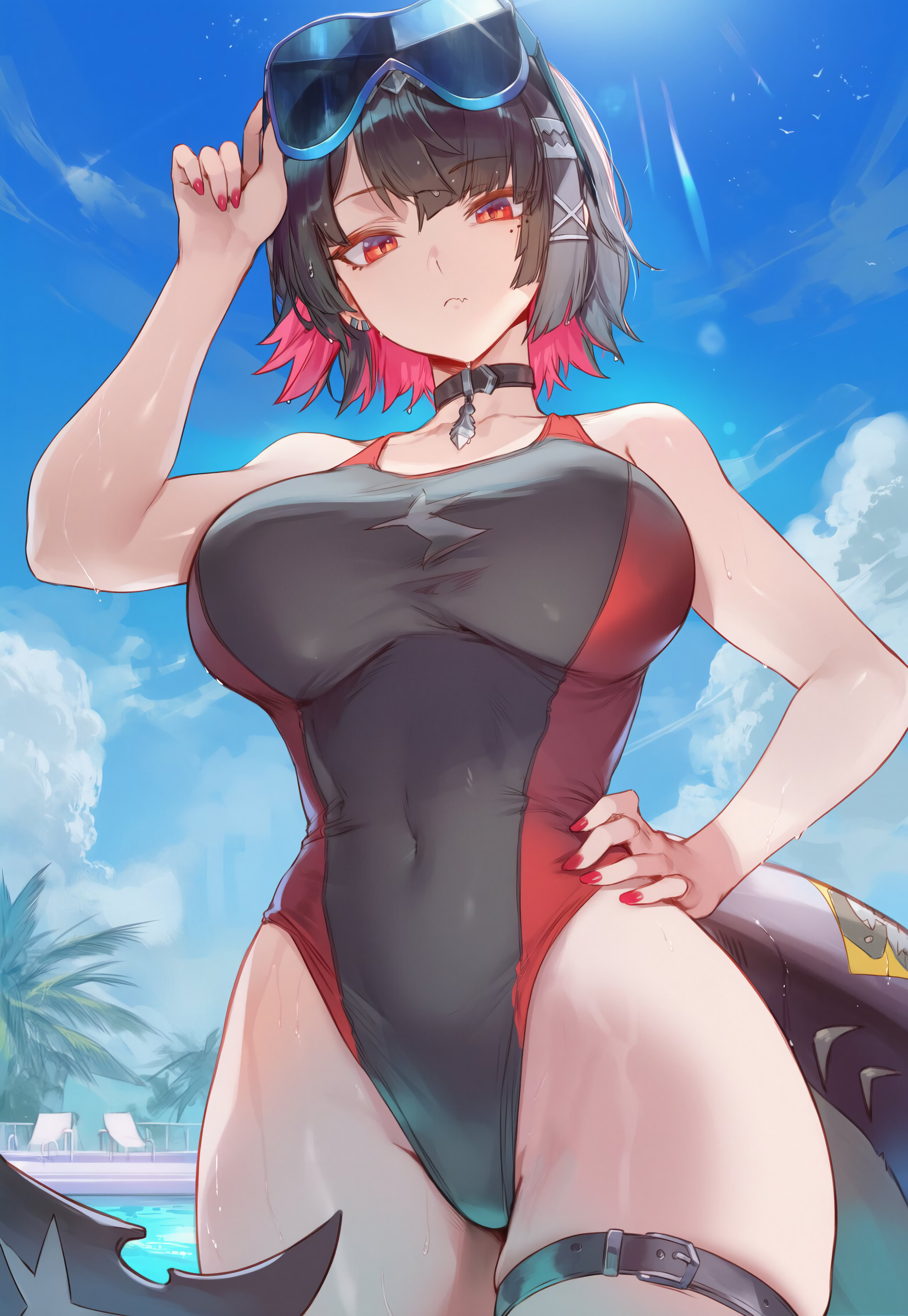 swimming goggles on head